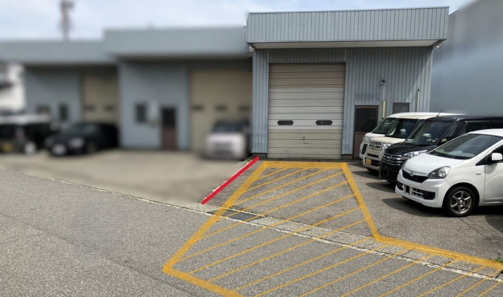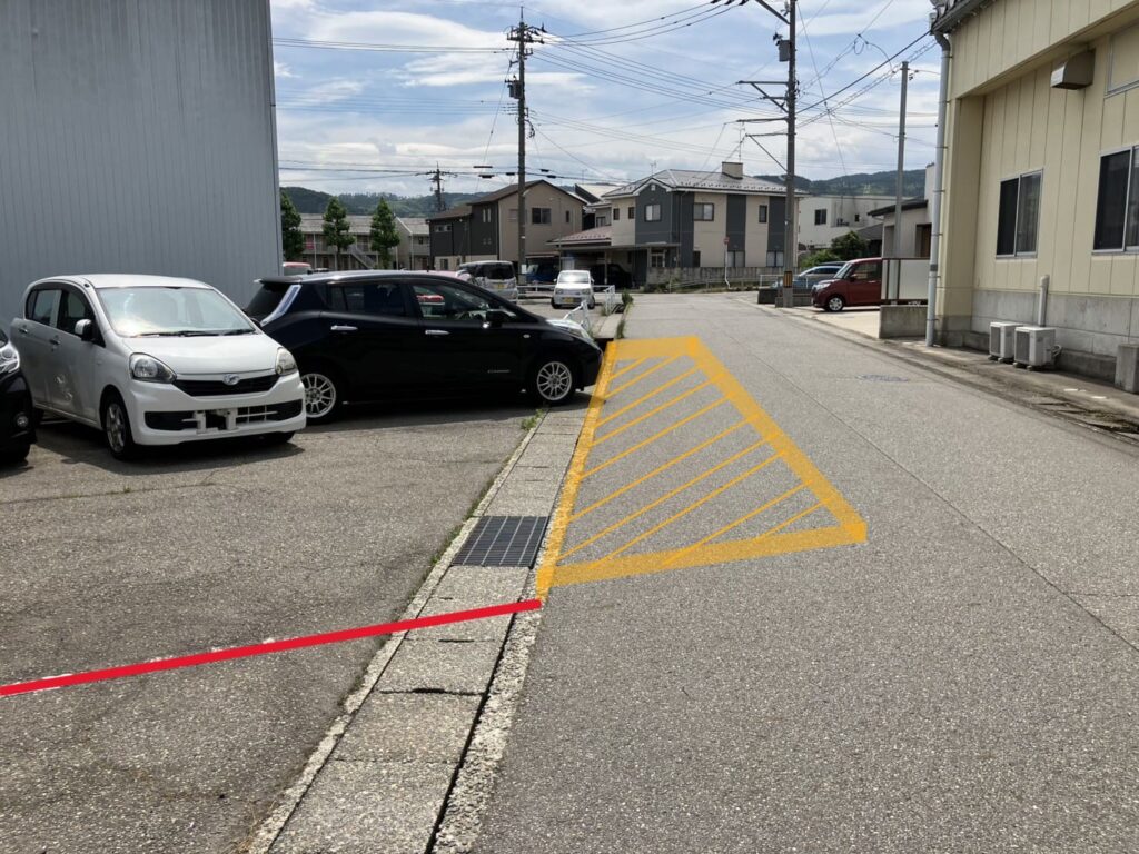 お車でお越しの際は、黄色の斜線で囲まれたスペース(写真参照)にご駐車ください。